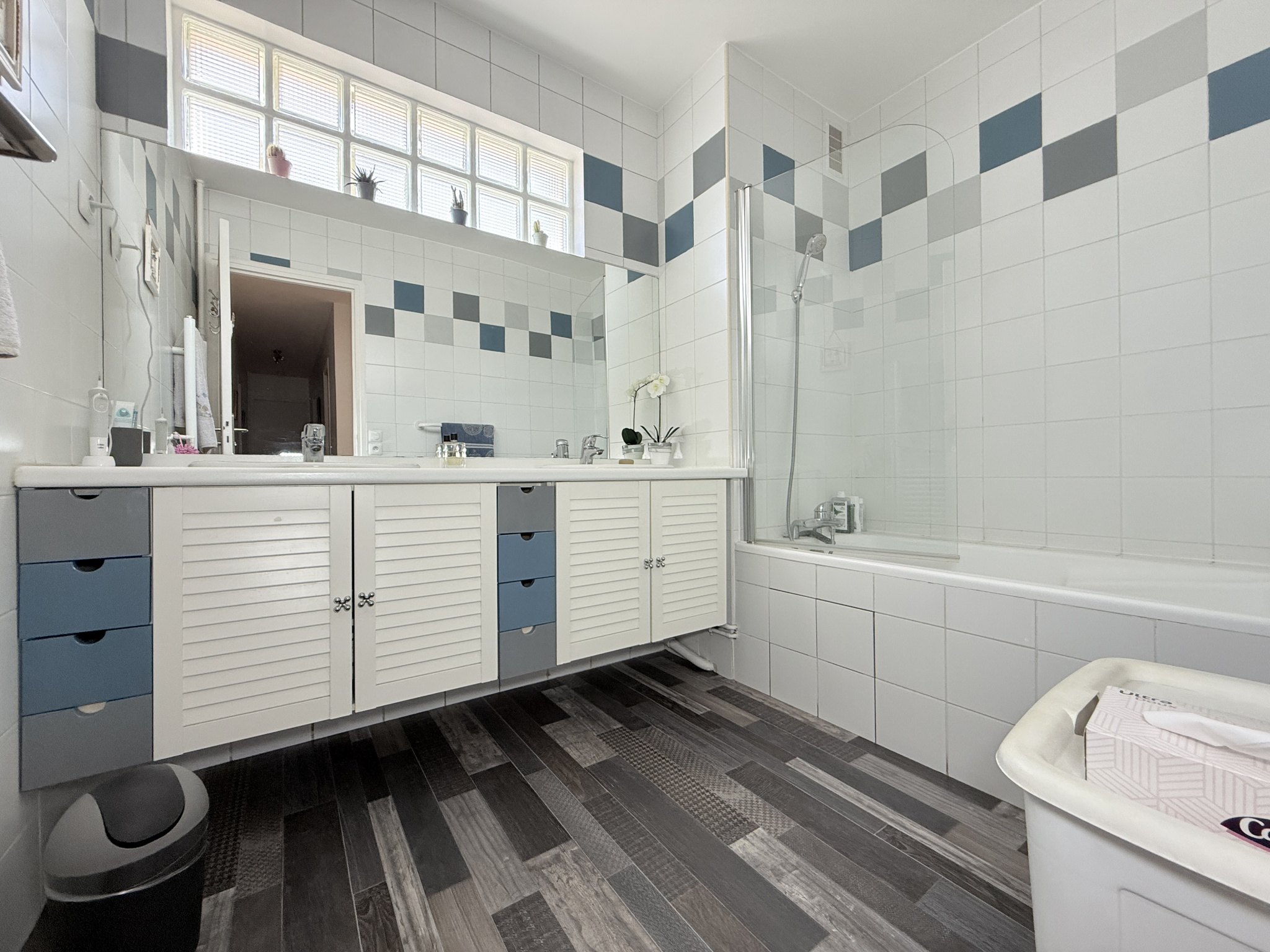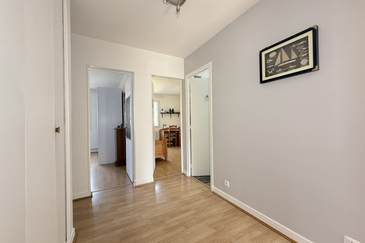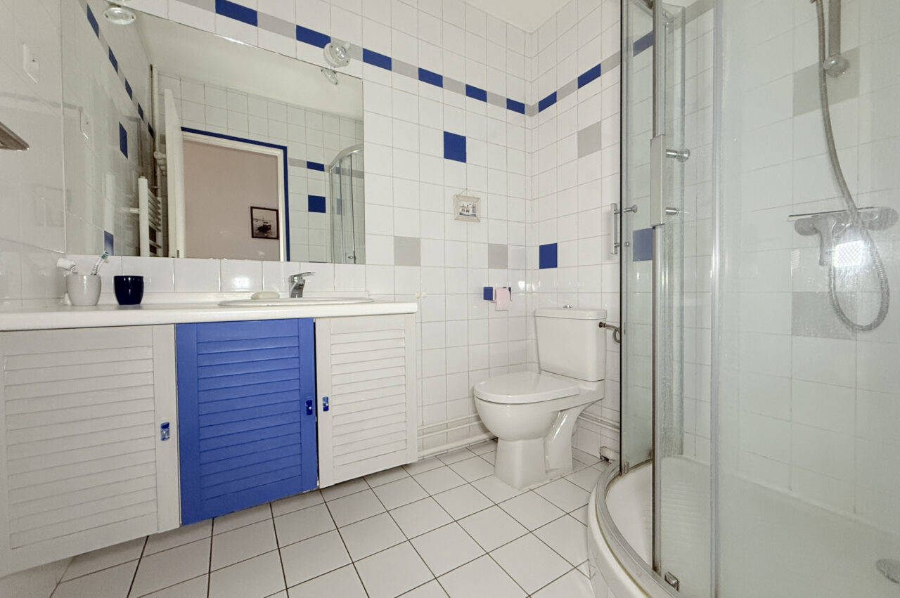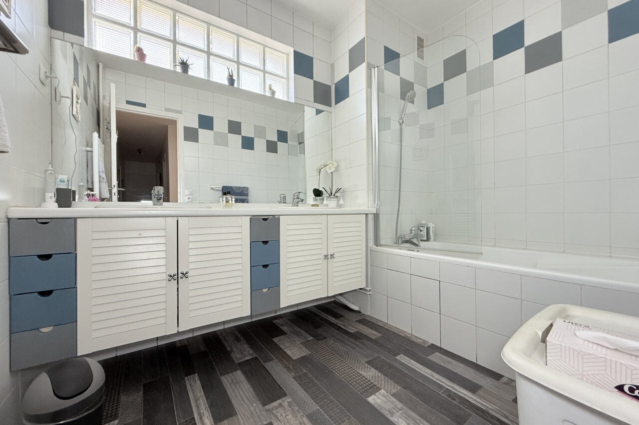 Salle de bain et salle de douche. L’appartement très lumineux est entièrement parqueté sauf dans les pièces humides, la peinture est soignée. Le bien est très calme, il profite d’un jardin paysager en fond de parcelle de la copropriété, idéal pour les jeux des enfants. Deux places de parking en sous-sol , côte à côte, et une cave pour le confort.
